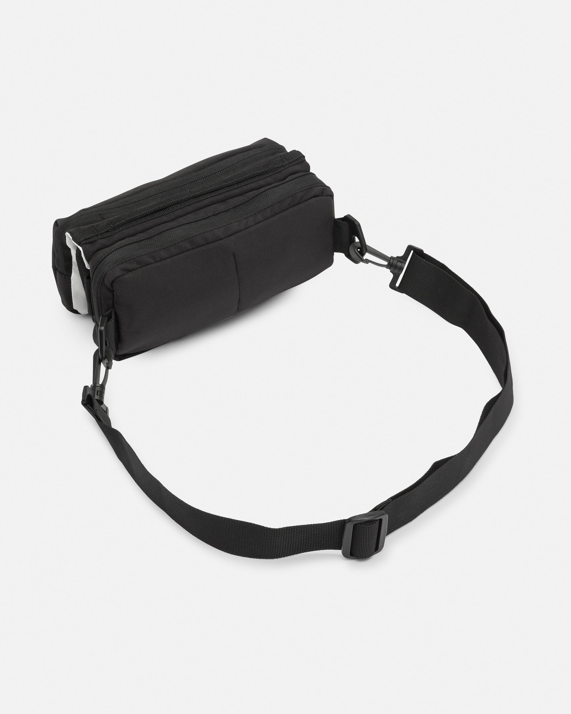 This black hip pack keeps the essentials locked and loaded. Two zip pockets and interior zip/slip stashes stay tidy. while a bungee water bottle holder rides between the zip pockets. Cinch the adjustable waist strap with our branded release clip or grab the webbing handle and roll.