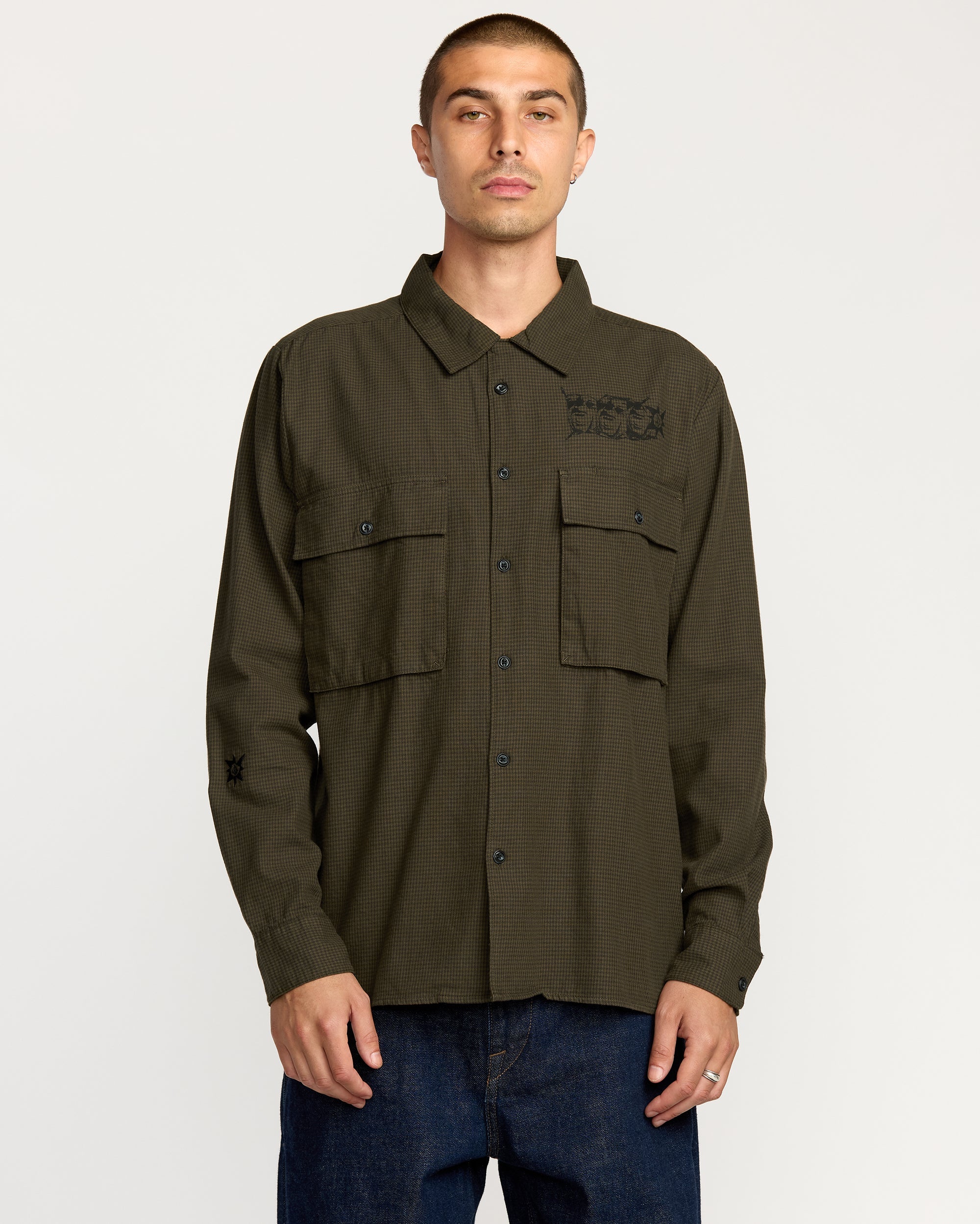 The POVJ Workshirt from Product of Volcom Japan pairs a boxy fit with yarn-dyed micro houndstooth in the Wren colorway. Double chest pockets do the heavy lifting. while Stone Star embroidery. custom logo buttons. and a screen print hit above the pocket keep it undeniably Volcom. Interior back-yoke print finishes it clean.